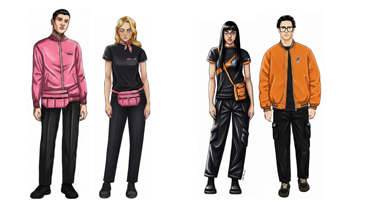 Para a criação das roupas, além da pesquisa temática, o mix de alfaiataria e streetwear foi utilizado como